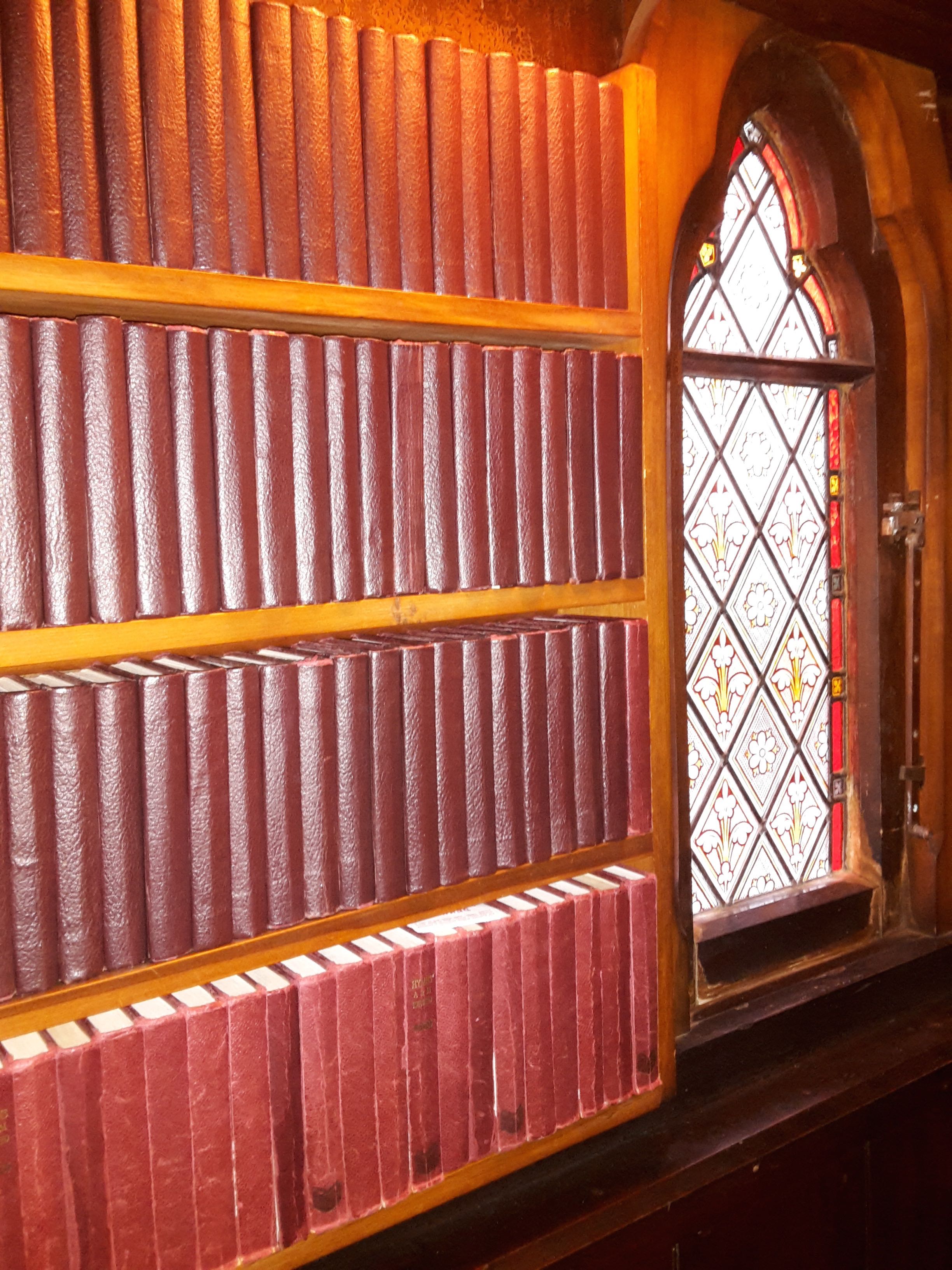 Copies of the Hymns Ancient and Modern stored in the baptistry.