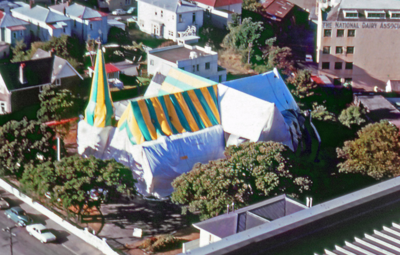 I’m currently writing a story about the restoration of Old St Paul’s, but in the meantime, I thought I’d share this great image, taken in 1969 when the church was being fumigated for borer (a beetle imported to New Zealand from Europe, which eats wooden houses and furniture).