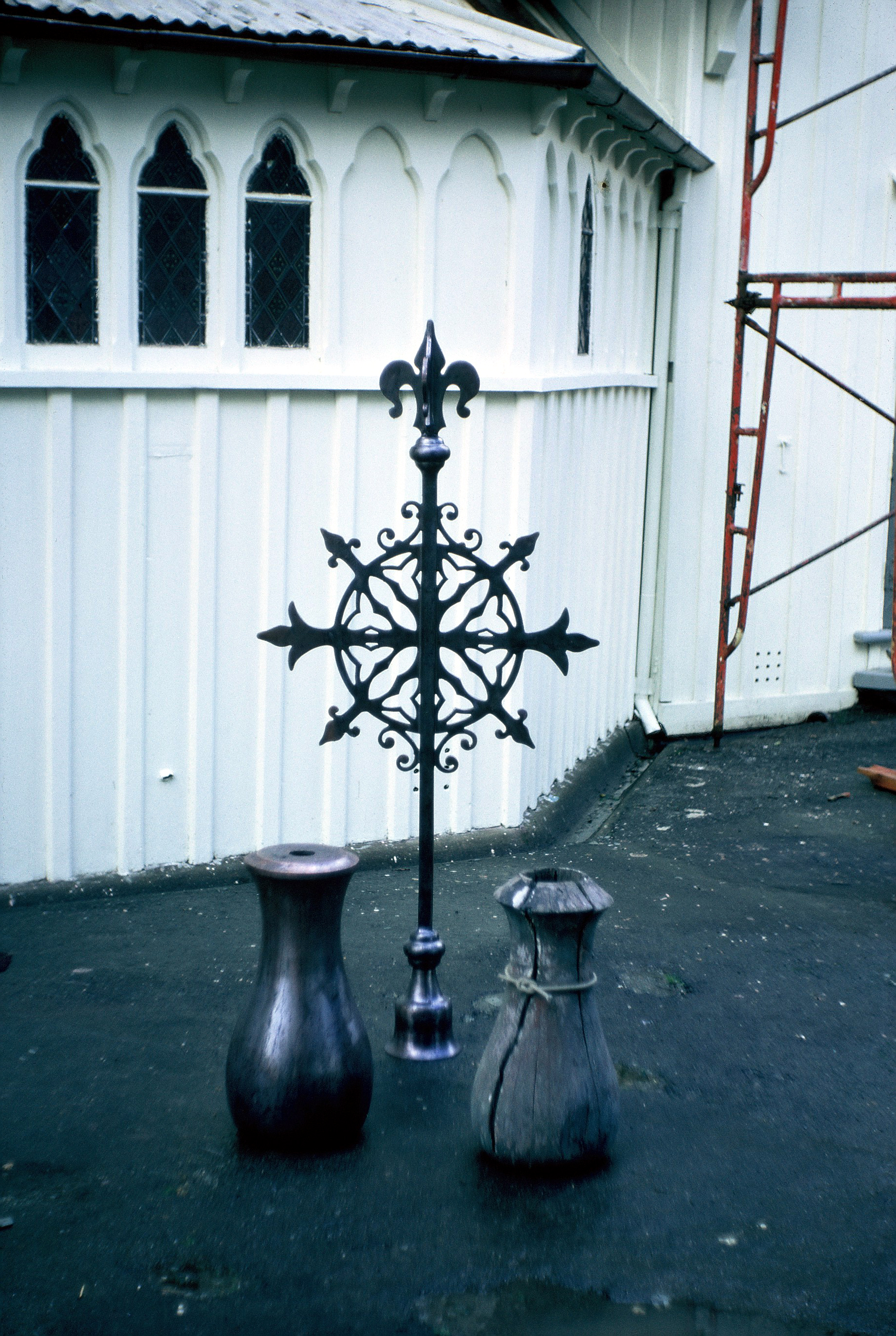 Images by Jim Bentall, 1969. The first image shows the cross, plus the new bronze base for the cross and the old wooden base, which was taken down from the spire. Images copyright Jim Bentall, not for reproduction.