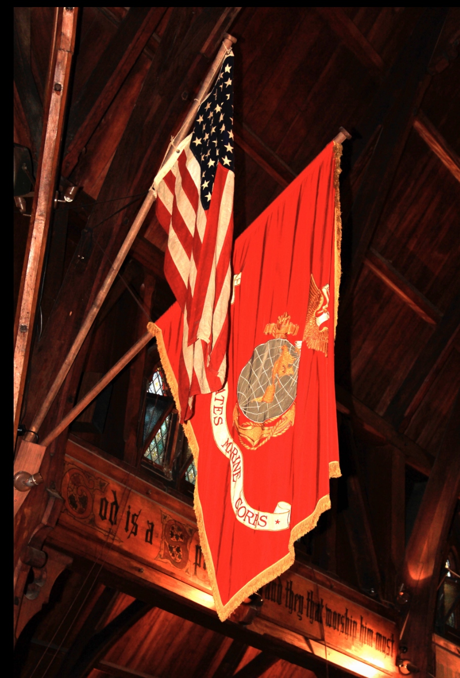 The red Second Marine Corps colours and the US stars and stripes (with 48 stars), hanging at the church.