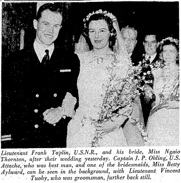 Another such couple was Lieutenant Frank E. Taplin and Ngaio Thornton (pictured below at their wedding at St Paul’s). Sadly, after having two daughters and a son, they divorced, as did many wartime couples. Frank went on to practice law and engage in business back in Cleveland and became a notable philanthropist of the arts.