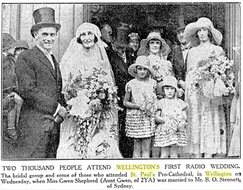 When popular radio personality Gwen Shepherd married Bob Stennett at Old St Paul’s, in 1930, it was big news throughout New Zealand. Aunt Gwen, as she was know, was a broadcaster for children’s radio on 2YA, during the height of radio’s popularity. At that time, children’s broadcasters were just becoming well-known personalities. Her wedding was broadcast on the radio for her young fans around the country.