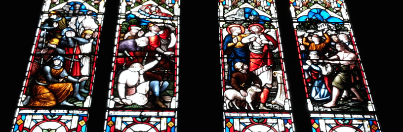 The window itself depicts the life, appropriately enough, of St Paul. I think I am right in saying that this window, and one wooden carving on the pulpit, are the only representations of St Paul in the church. The two windows on the left shows Paul’s moment of conversion to Christianity on the road to Damascus, and the two on his right show scenes from travels preaching the gospel with St Barnabas, when he was in Lystra, in what is now Turkey. While there he healed a man, and he and Barnabas were mistaken for the gods Hermes and Zeus, so tore their clothes, to show they they were only men.