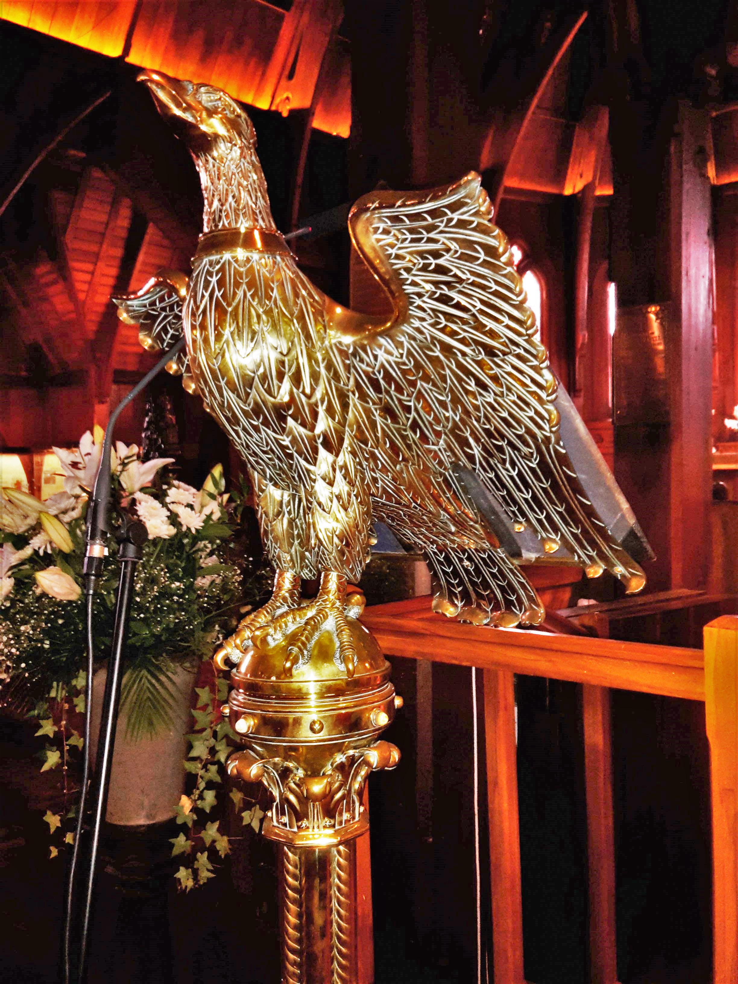 The lectern at Old St Paul’s is made entirely of brass and features many religious symbols and figures. Of prominence is the large eagle with outstretched wings in the act of flying upwards, which sits atop an orb. This is where the bible rests. It is thought to represent the Spirit rising above the letter of the law, the orb being a Christian symbol of sovereignty. The base of the lectern is supported by four small lions, and the buttresses are decorated with images of the four evangelists (see photo above). Such an ornamental piece of work was described in the Evening Post, when it was installed in 1881: