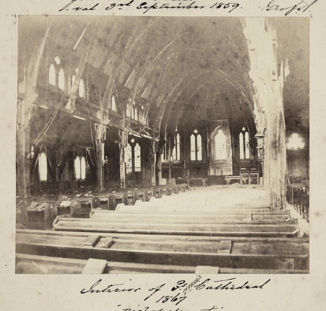 Images: Modern photos of window, 2015, copyright Paul Scott http://paulscottinfo.ipage.com/nz/cathedrals/wellington/oldstpauls/tn.html; Historic photos: Wellington Hospital, Pipitea Street, Thorndon. Davis, William Henry Whitmore, 1812-1901. Ref: 1/2-230730-G. Alexander Turnbull Library; Interior view of St Pauls Pro-Cathedral, Wellington, New Zealand. Harris, George Frederick: Album of Wellington photographs. Ref: PA1-q-541-12-2. Alexander Turnbull Library.