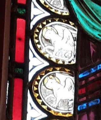 It is interesting to note that the saint’s name panels in the window are actually the wrong way around. St Mark is always symbolised by the image of a winged lion, and this symbol is used in the little roundels (as shown below) around his body; but the window name says that this is St Luke; and likewise, St Luke is always symbolised as a bull; but in this window the roundels show a winged lion.