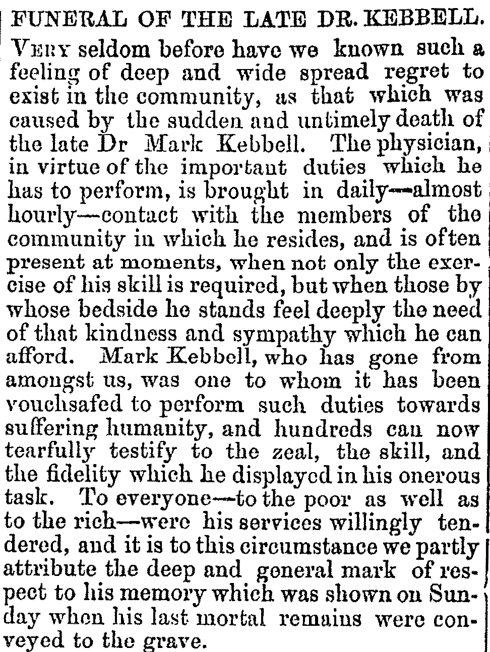 Dr Mark Kebbell arrived from England to Wellington in 1857. He was the youngest of 12 children. As well as being a member of the Royal College of Surgeons, he was also the coroner for the district. He married Louisa Bowler in 1858 at St Paul’s. They had three children before Kebbell contracted scarlet fever. It is said that he stayed through the night nursing a young girl who was sick with the contagious bacterial disease and then caught it himself.