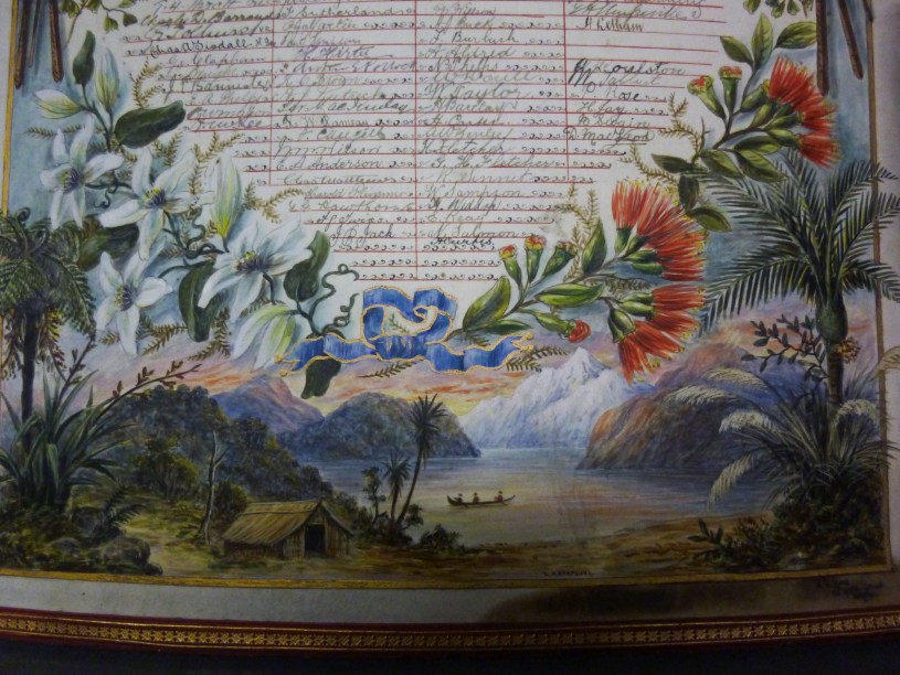 The address also features small scenes of Wellington, including St Paul’s, Government House, Queen’s wharf, and Bishop’s Court, which was going to be the new home of Wallis and his wife.The address is in a book form with an ornamental kauri wood cover. See main image above, and the images below (click to view larger).
