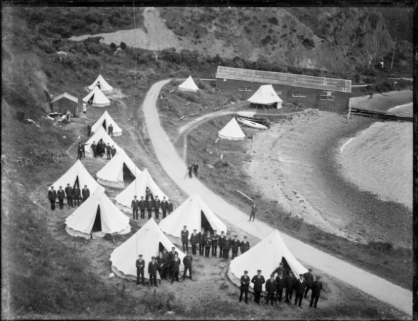 Sources: Dominion, 13 April 1908, p7; New Zealand History website, http://www.nzhistory.net.nz/the-russians-are-coming. Historic images: Submarine and Torpedo Mining Corps annual camp, Shelly Bay, Wellington, c.1899. Photos Ref: 1/1-020236-G; 1/2-091774-F; 1/2-091775-F; 1/2-091780-F, Alexander Turnbull Library.