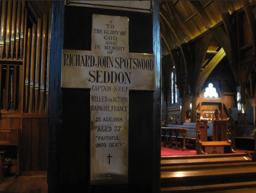 Dick’s brass at Old St Paul’s is not the only memorial he received in Wellington. The Seddon Memorial and family tomb in Bolton Street Cemetery bears a marble plaque with his name. Inside the tomb hangs the wooden cross from Dick’s grave in France. It was removed from the grave when a uniform headstone was erected, and was brought home to New Zealand by one of his sisters. While the family tomb was the resting place Louisa so desired for her son, Dick Seddon is caught in a larger story, and although his grave is no more distinguished than those beside him, he should not be ashamed to take his place there.
