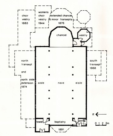 Before and after the addition of Toxward’s new south transept (the area with the large window facing the photographer in the second photo).