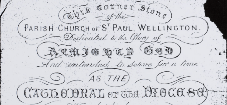 The foundation stone may be lost, but luckily the silver trowel is on display. It was not always at Old St Paul’s, as it was given to Governor Grey a few months after the ceremony by the church’s Building Committee, the Bishop and Marriott, in yet another ceremony. The newspaper recorded that on one side the engraving on the trowel said it had been presented to Grey ‘on the occasion of his laying the first stone of the Joint Cathedral and Parish Church of St. Paul’s’, with the words surrounded by scrolls, shells, and vases of flowers and on the back, the Holy Bible resting upon a rock, above which was the Eye of Providence, both surrounded by a ribbon bearing the command, Love ye one another.